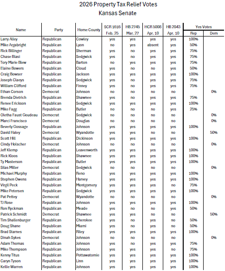 One House Republican (Kyle McNorton – Shawnee Co.) and seven of the nine Senate Democrats voted “no” on every bill. Another House Republican (Brian Bergkamp – Sedgwick Co.) voted against eight of the nine property tax measures.